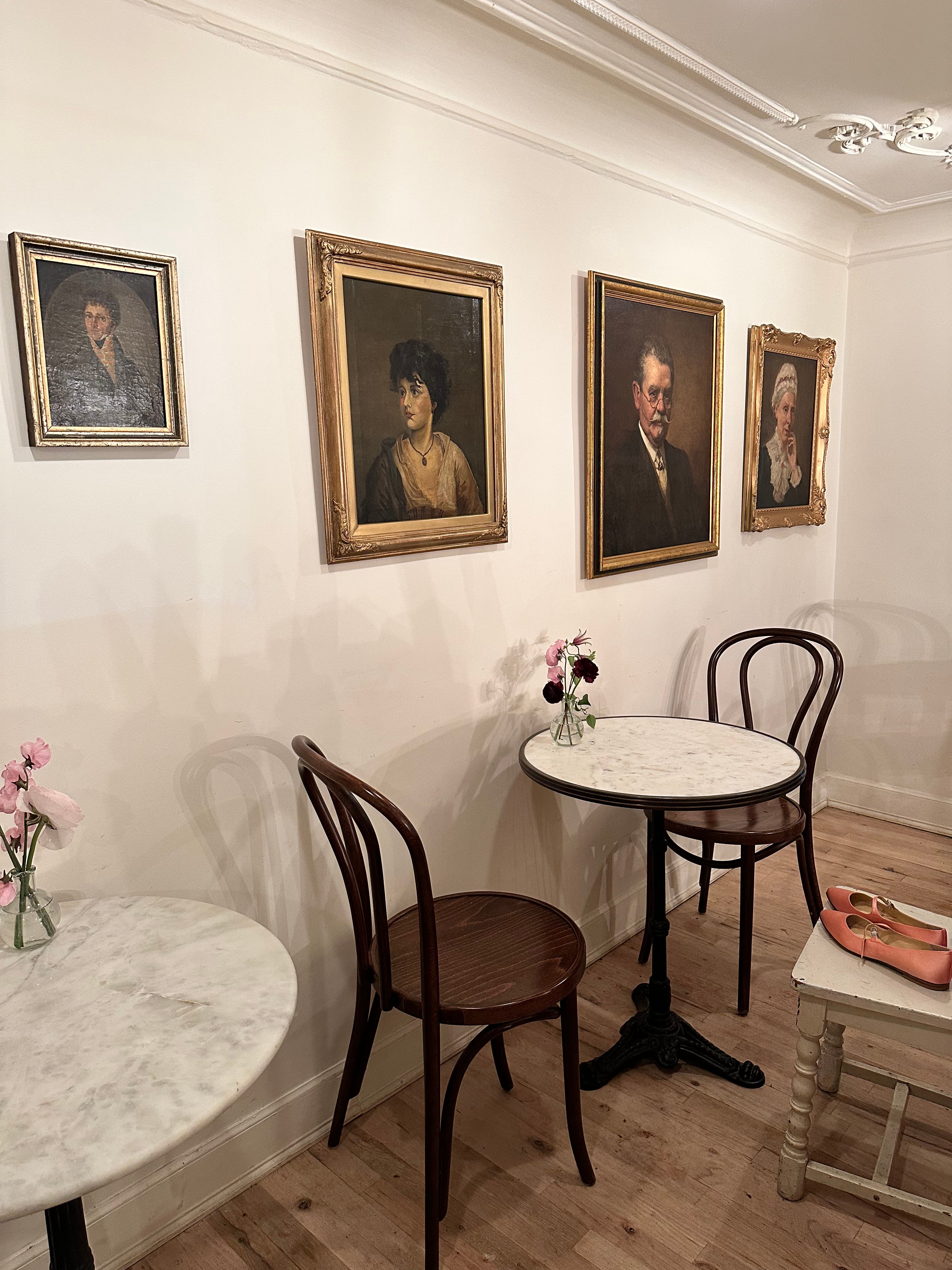 The bay windows outside their Montague Street space provide a glimpse into the enchanting two-story bakery. Downstairs, there’s a bustling kitchen behind a display case full of croissants, cookies, and loaves of bread. Alongside that, an antique hutch adorned with ceramics, glasses, and other tchotchkes. Upstairs, small vases of flowers decorate marble tables with bistro chairs, and gold-framed portrait paintings line the walls. On the ceiling above both floors, a candle chandelier embellished with crystals and glass beads hangs overhead.