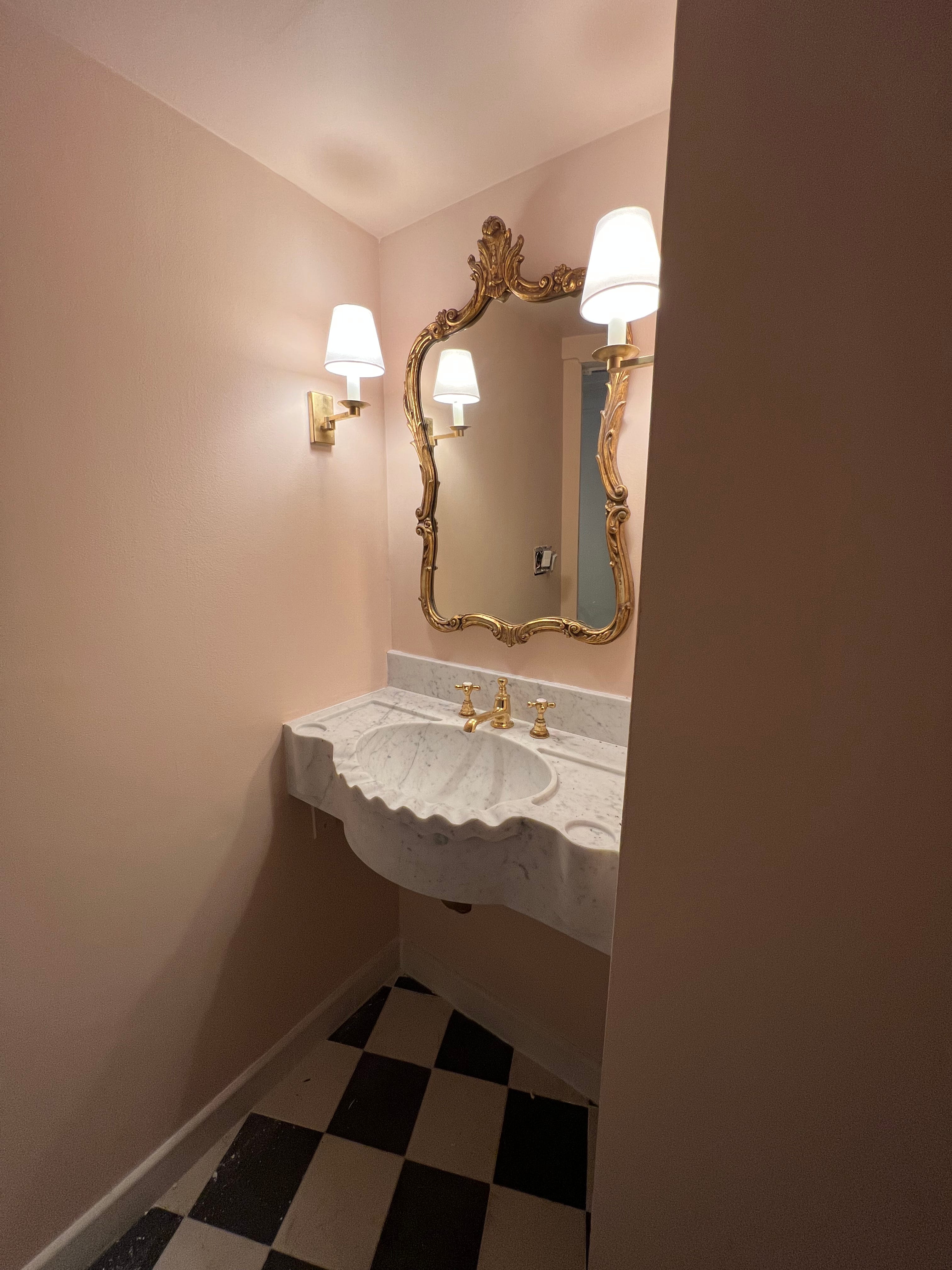 Before we opened the space, I really wanted to incorporate a classical carved marble stone sink basin from Italy that was straight from my Pinterest board. I always dreamed of having one of these sinks with a scalloped edge. They are so soft and pretty and I knew I wanted it in the space before we even designed it.