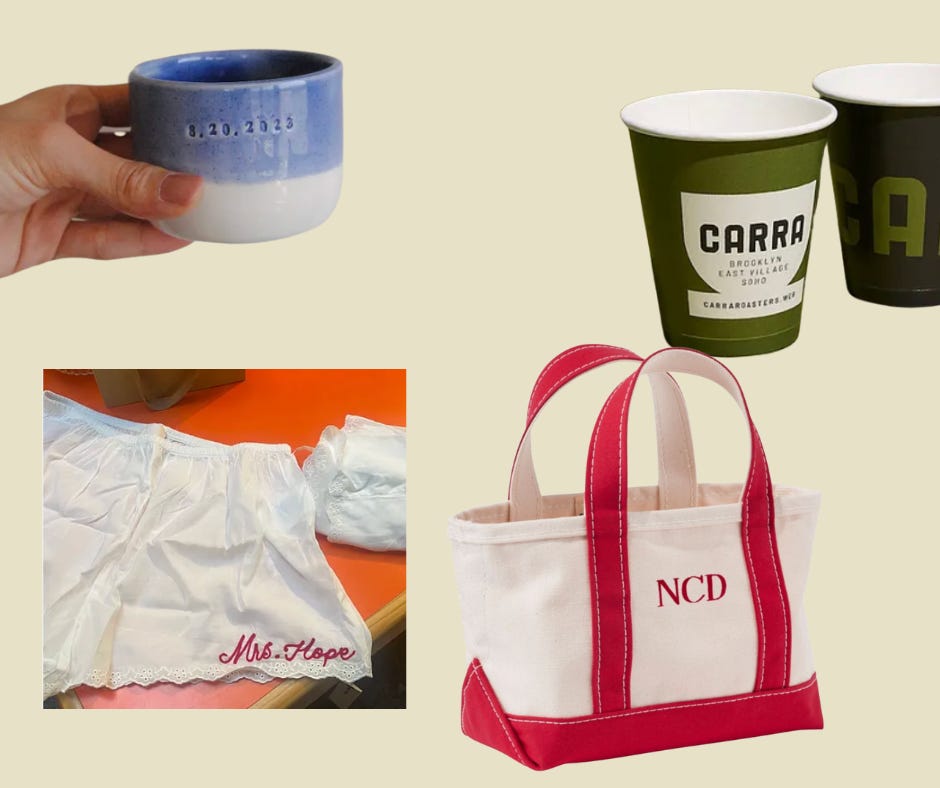 Get thee to EVA JOAN! I’ve gotten so many gifts embroidered there; it’s a simple way to level your gift up. I also had the idea of getting someone a set of custom paper travel cups ($4.90 ea)—my husband makes coffee everyday and I’d love to give him some “Aaron Cafe” cups, or better yet, a custom espresso mug ($24). You can put all your gifts in a monogrammed mini boat and tote ($25).